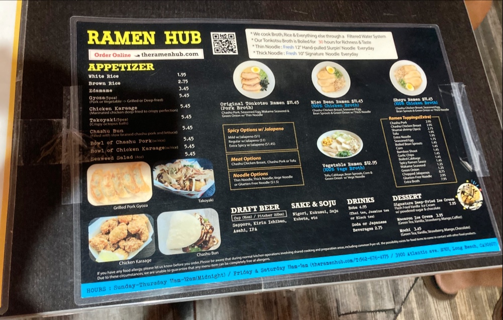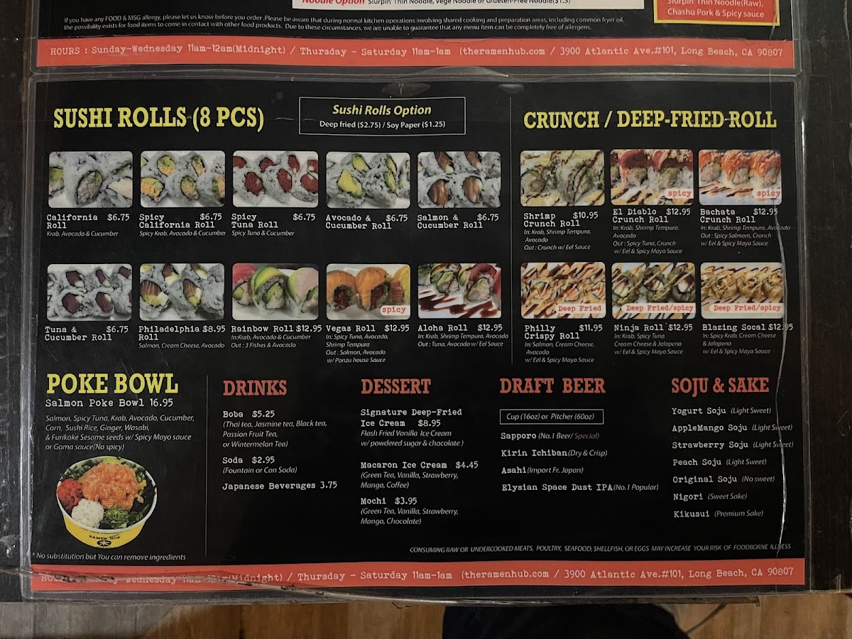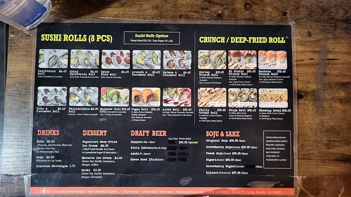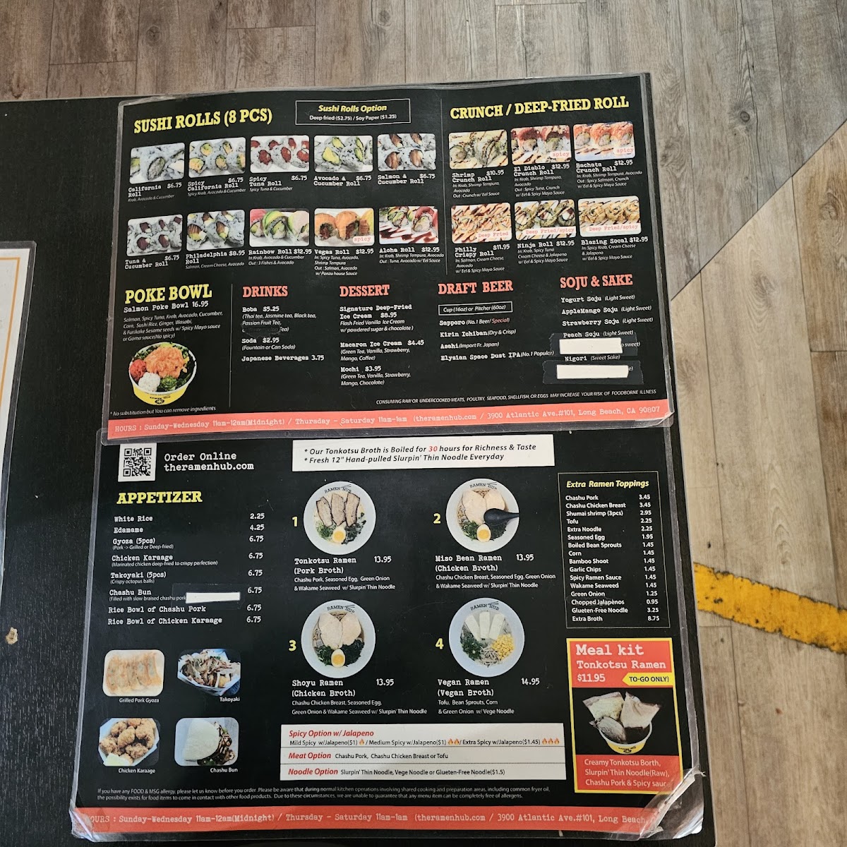 Ramen Hub & Sushi - Long Beach offers a harmonious blend of authentic ramen and sushi that satisfies both traditionalists and adventurous eaters. Located on Atlantic Ave, this spot is famous for its comforting chicken broth ramen, featuring tender chashu chicken breast, perfectly seasoned eggs, and fresh green onions. The menu also shines with its vegan ramen, boasting a creamy broth paired with spinach noodles and tofu, making it a thoughtful option for plant-based diners.