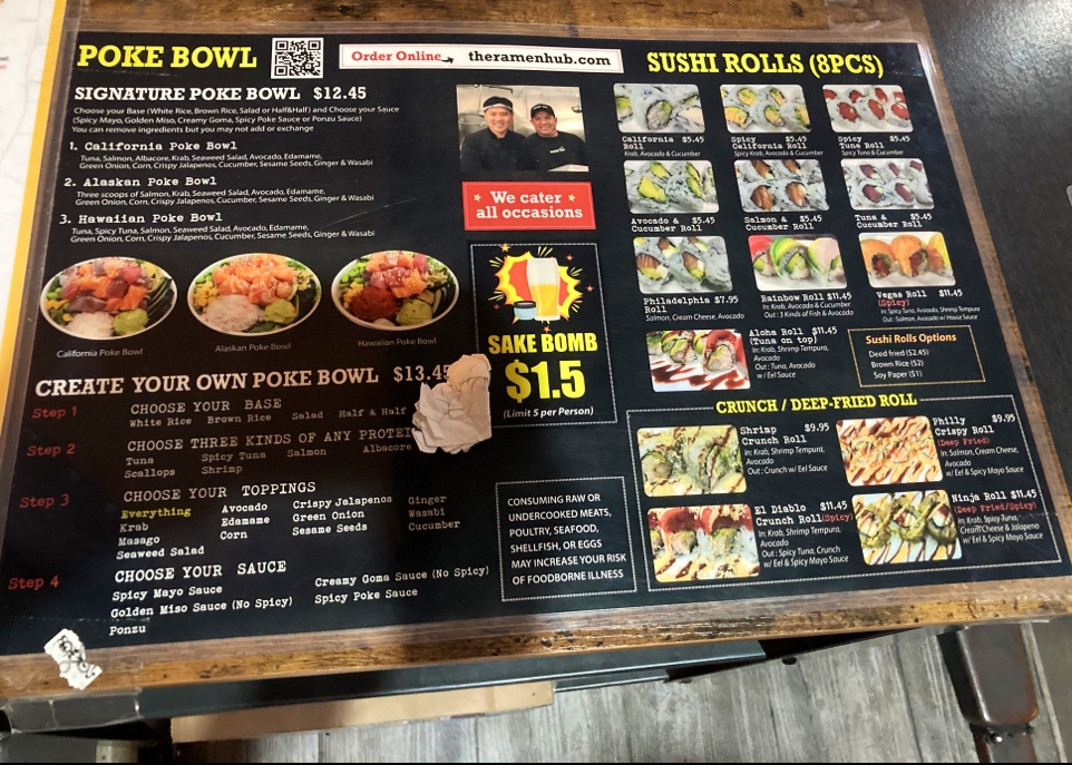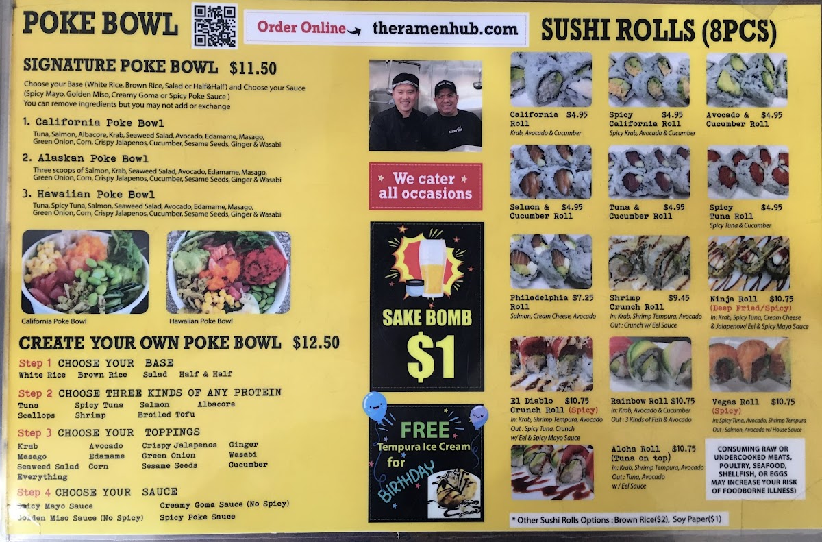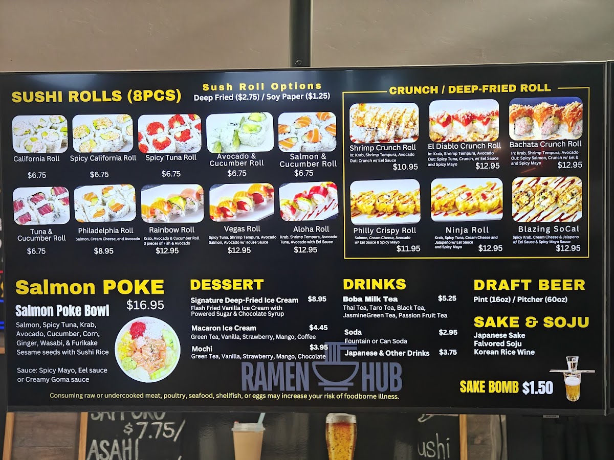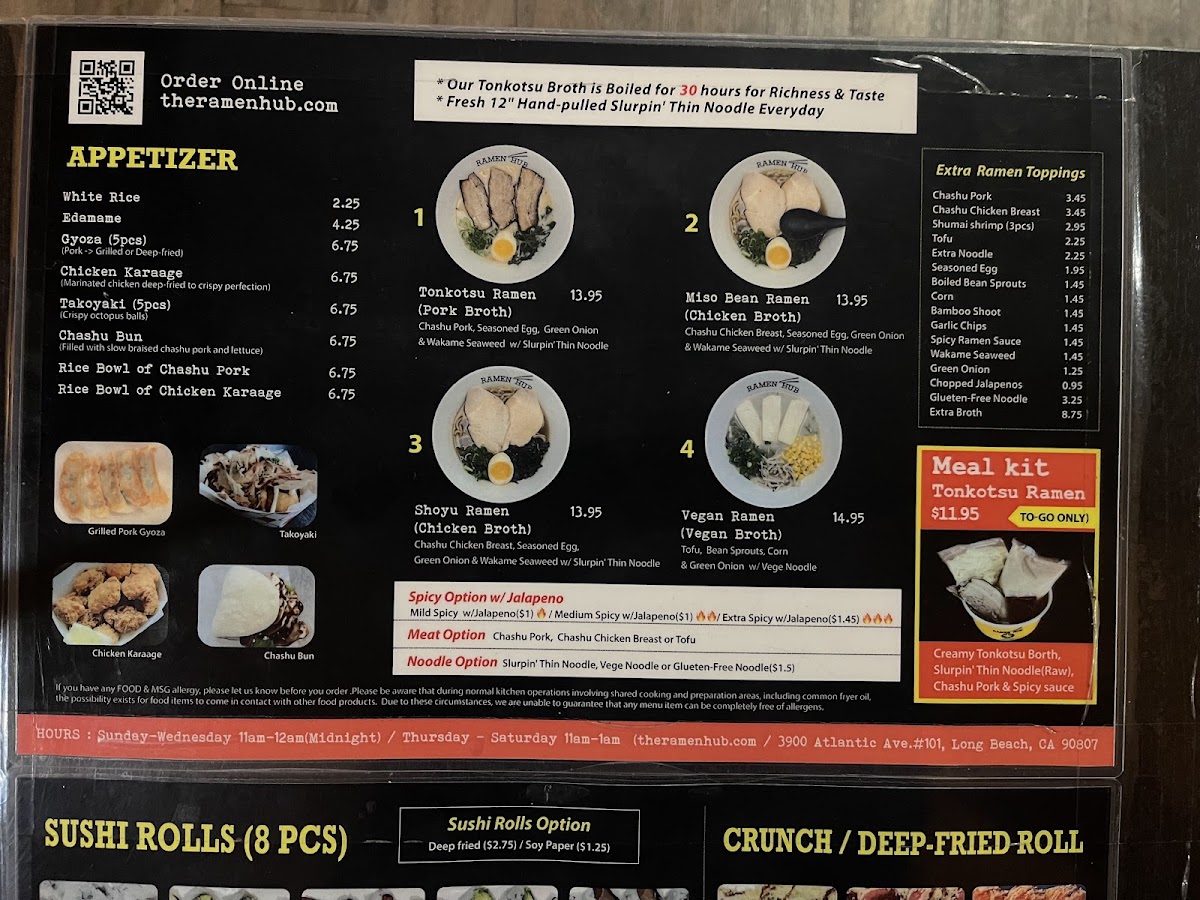 Ramen Hub & Sushi - Long Beach offers a harmonious blend of authentic ramen and sushi that satisfies both traditionalists and adventurous eaters. Located on Atlantic Ave, this spot is famous for its comforting chicken broth ramen, featuring tender chashu chicken breast, perfectly seasoned eggs, and fresh green onions. The menu also shines with its vegan ramen, boasting a creamy broth paired with spinach noodles and tofu, making it a thoughtful option for plant-based diners.